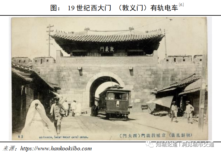 随着19世纪末国家的开放,近代交通工具登场,首尔市交通体系发生了翻天覆地的变化。1899年,西大门至清凉里第一条单线有轨电车开始运行,全长8公里,有轨电车成为了首尔市内主要交通工具。同年9月,韩国第一条城际铁路京仁线开通[3](首尔市到仁川市),总长27公里。