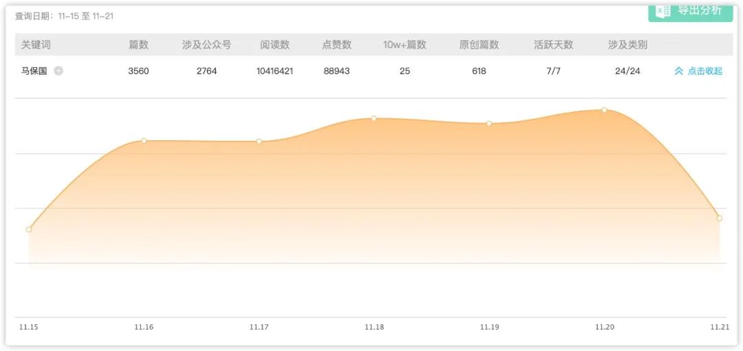 不仅是B站,微信、微博、抖音等多个平台也都有马保国的身影。在微信上,最近7天有3560篇关于马保国的文章,其中出现了25篇10万+推文;在微博上,#马保国#相关话题曾5次登上微博热搜榜单。