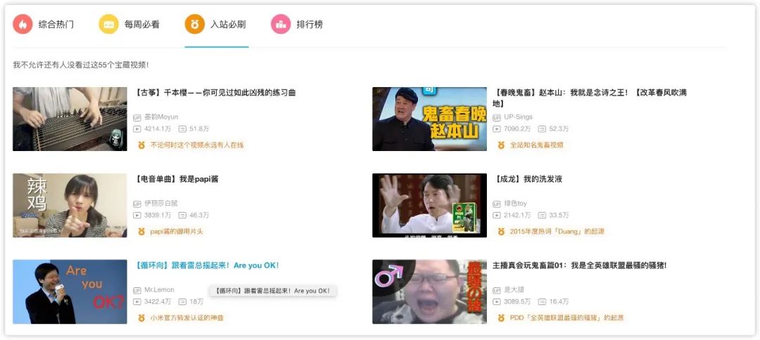 在B站“入站必刷”的55条视频中,其中有15条是鬼畜相关,可见其影响力之大,只是大部分都是2018年及之前的神作,再之后鬼畜区神级UP主有些或隐退或转行,有些留下的也成为了年更博主,“四大欠王”的组合也早已成为了过去。