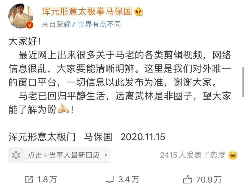 11月15日,马保国在微博上首度回应自己的视频素材被二次创作剪辑,称已经“回归平静生活,远离武林是非圈子”。