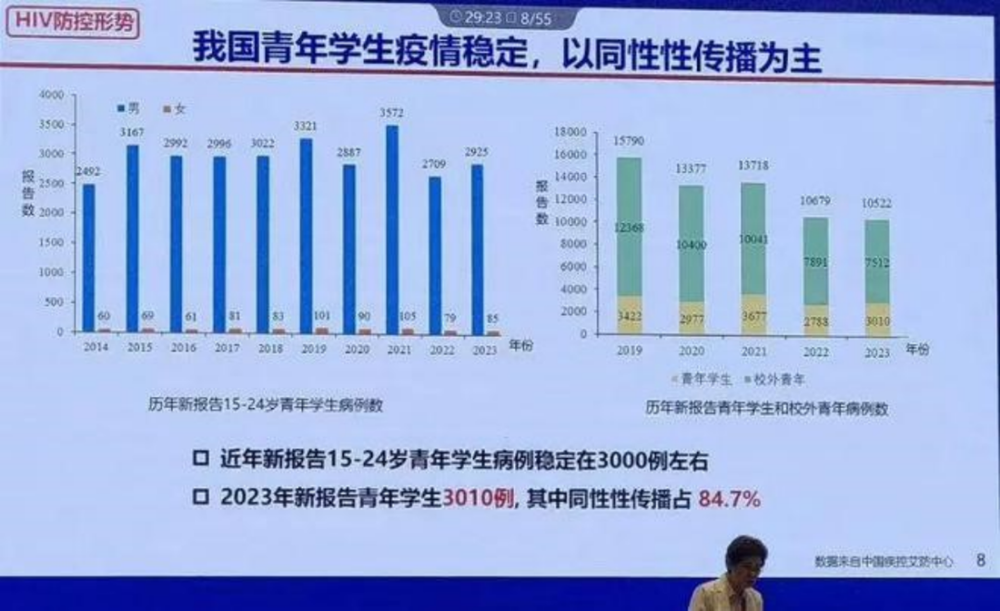 而据相关数据,2020年至2023年,新报告青年学生病例分别为:2977人、3677人、2733人、3010人,四年间共报告12397人。2010年至2023年间,报告青年学生感染病例已达35704人。