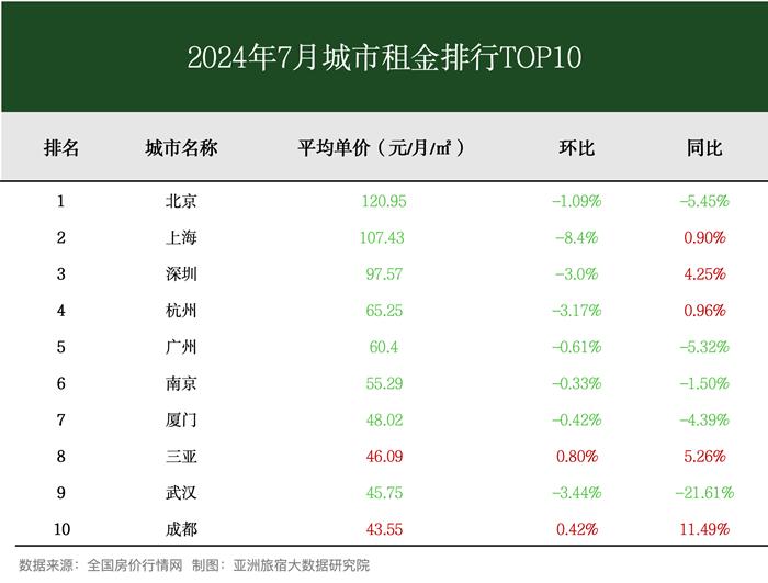 全国租金中位数为1900元/月,环比0.00%,同比下降5%。7月,前10城市租金2升8跌