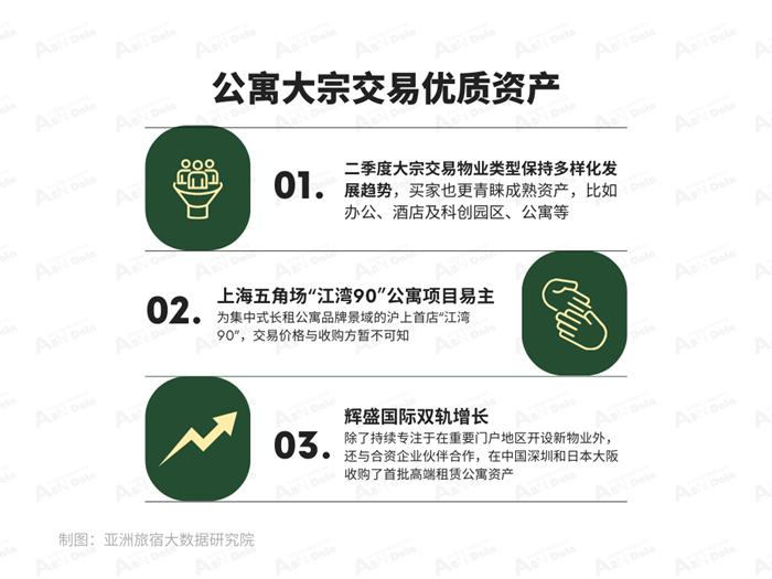 7月,根据亚洲旅宿大数据监测数据,二季度大宗交易物业类型保持多样化发展趋势。其中,办公写字楼交易依旧保持领先,二季度交易额达114亿元,占比较一季度有所提升,达35%。买家也更青睐成熟资产,比如办公、酒店及科创园区、公寓等,同时对资产是否带有租约、租金收益以及区位等都有明显的要求,希望在这些优质资产上寻求更强的安全感和相对确定的收益。投资者则格外青睐优质酒店和公寓资产。如二季度广东富豪买入上海雅诗阁衡山服务公寓,上海投资者买入上海中兴路板块的秋果酒店。
