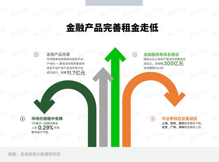 7月,随着公寓金融产品的逐步完善、保租房大量入市等原因,公寓产品价格持续走低。中央和地方层面积极施策下,可以预见的是,住房租赁市场正形成多层次的供给体系,租金价格更趋于合理态势。