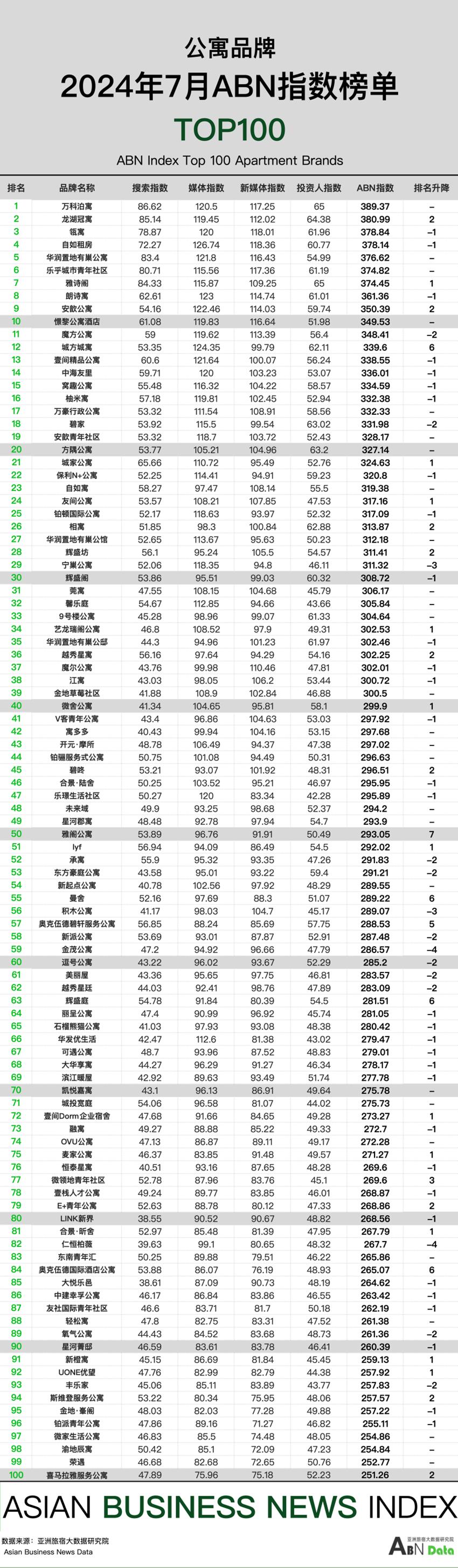 7月,根据亚洲旅宿大数据研究院(ABN指数)监测,多家公寓品牌产品面世开业试营业或签约筹建。代表项目如下:
