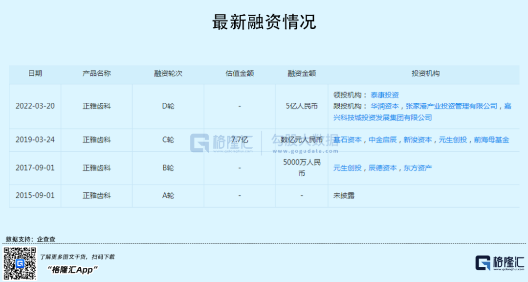 公开信息显示,近日,正雅齿科完成了D轮融资,融资金额达到5亿人民币,投资机构包括泰康投资、张家港产业投资管理有限公司等。