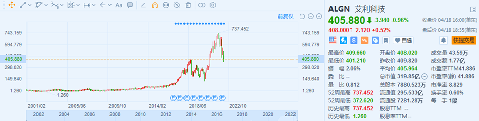 纵观市场格局,在过去,美国艾利科技研发并设计出来的世界首个隐形牙齿矫正器品牌——隐适美一度垄断了市场,它自身也凭借这一人气大单品也成为了大牛股。