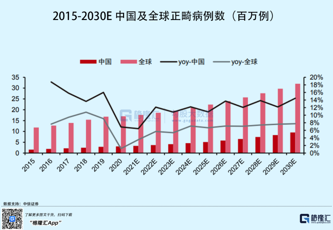 于是,正畸人群开始涌现,要知道,错颌畸形是世界卫生组织认定的口腔三大疾病之一,而中国市场是全球第二大的正畸市场,仅次于美国,2020年我国约有10.4亿人患有错颌畸形病例,但正畸渗透率并不高,行业处于起步期,但颇具成长性和确定性。