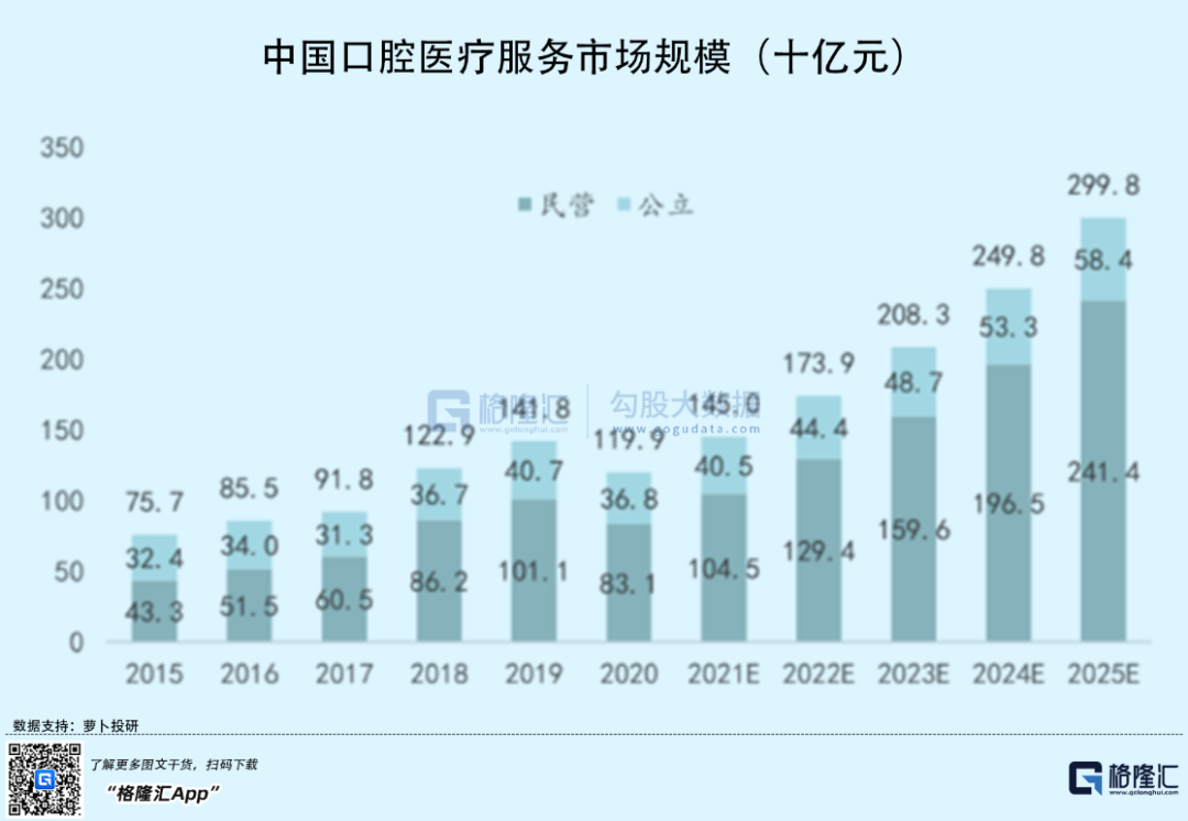 而在口腔护理意识不断增强的背景下,口袋里有了“闲钱”的人们自然想要美上加美,精益求精。公开数据显示,2020年中国口腔医疗服务的市场规模为1199亿元,预计这一市场规模到2025年达到2998亿元;2020 年我国人均口腔消费支出达到 136 元,不过仍远低于韩国(2697 元)美国( 2123 元)等,存有增长空间。