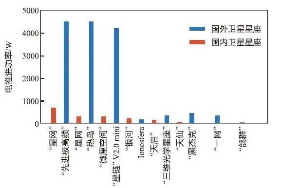 我国卫星星座的电推进系统功率分布在12~700W之间,推力为0.3~40mN,比冲为200~2000s;国外卫星星座使用的电推进系统功率分布在40~4500W之间,推力0.35~294mN,比冲1244~3500s,电推进系统功率的分布规律与星座卫星的质量分布一致,如图4所示。从“星链”V2.0 mini采用了4.2kW霍尔电推进角度来看,星座采用电推进功率有增大的趋势。