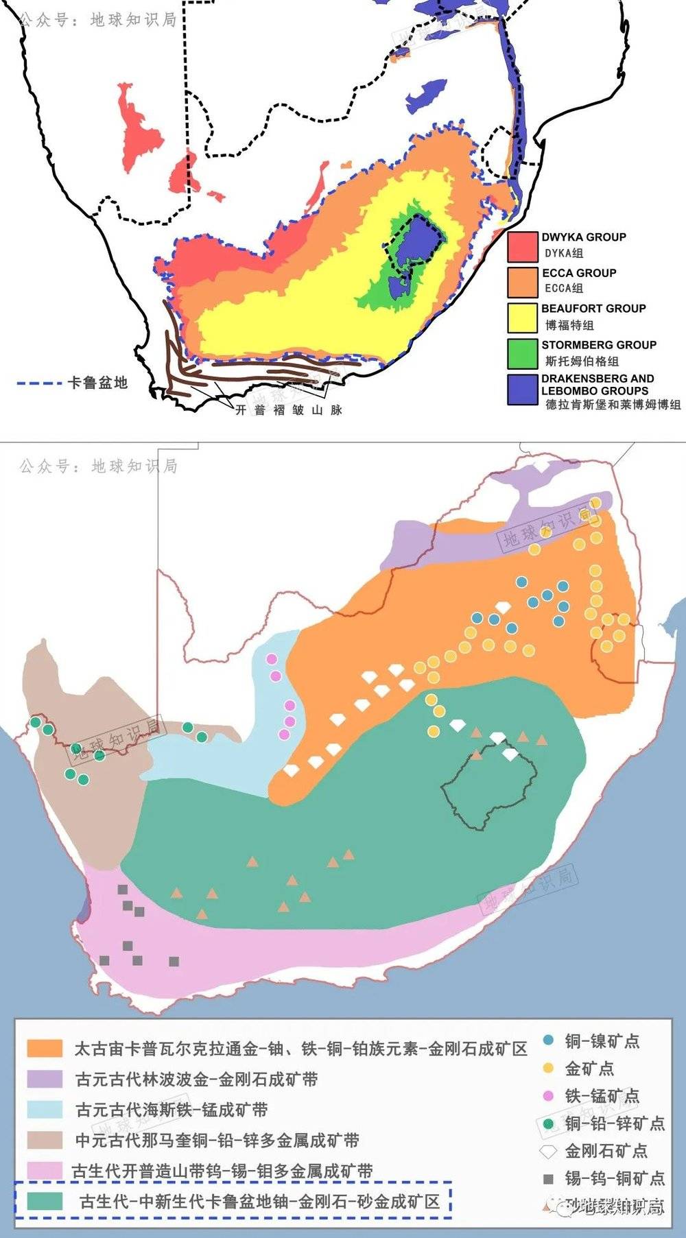这些矿床的形成都与古老地壳在后来的地质过程中被岩浆作用、沉积作用等改造有关。这些矿床在地表长期经历风化、搬运后,堆积在海拔较低的地区(卡鲁盆地),就形成了古生代—中新生代卡鲁盆地铀-金刚石-砂金成矿区。