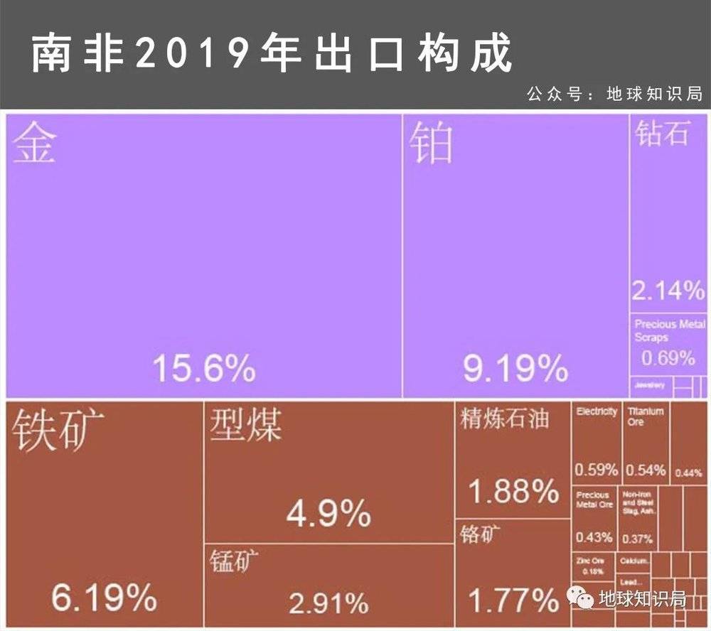 铂族金属,也就是贵金属钌(Ru)、铑(Rh)、 钯(Pd)、锇(Os)、铱(Ir)、铂(Pt),其稀有程度和市价都远超黄金,在南非的储量占世界88.7%,其中铂(Pt)出口额为82.5亿美元,占南非出口总额的9.19%。