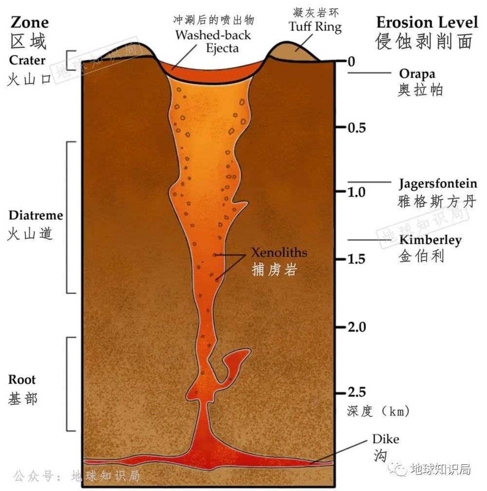 火山管道的发源深度至少是大多数其他火山的三倍,金伯利岩是钻石的主要来源(火山管 图:wiki)▼