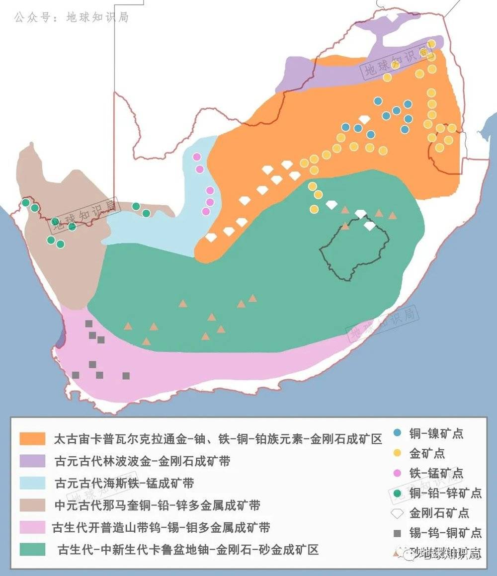 成矿区基本覆盖南非全境,真可谓是“矿中有家”。