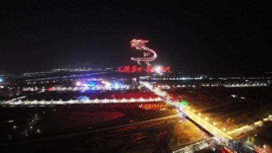 当晚,首先登场的无人机表演让现场观众大开眼界。千架无人机在操控下有序升上天空,一开始便组合出一条气势磅礴的巨龙形象。金龙昂首,身上的“鳞甲”在白杨河畔月光的映照下熠熠生辉,龙尾轻轻摆动,仿佛要搅动红河谷的赤霞。