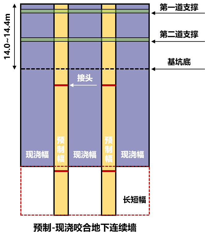 “预制-现浇咬合式地下连续墙”由交替排列的预制墙幅与现浇混凝土墙幅咬合形成,预制墙幅采用长墙,现浇墙幅采用短墙。与传统现浇地下连续墙相比,该技术通过截面优化和技术更新,节约钢筋和混凝土用量,减少现场钢筋笼焊接,节约用电,减少光污染和环境污染,具有质量好、速度快、费用低、绿色低碳、可持续发展等显著特点。