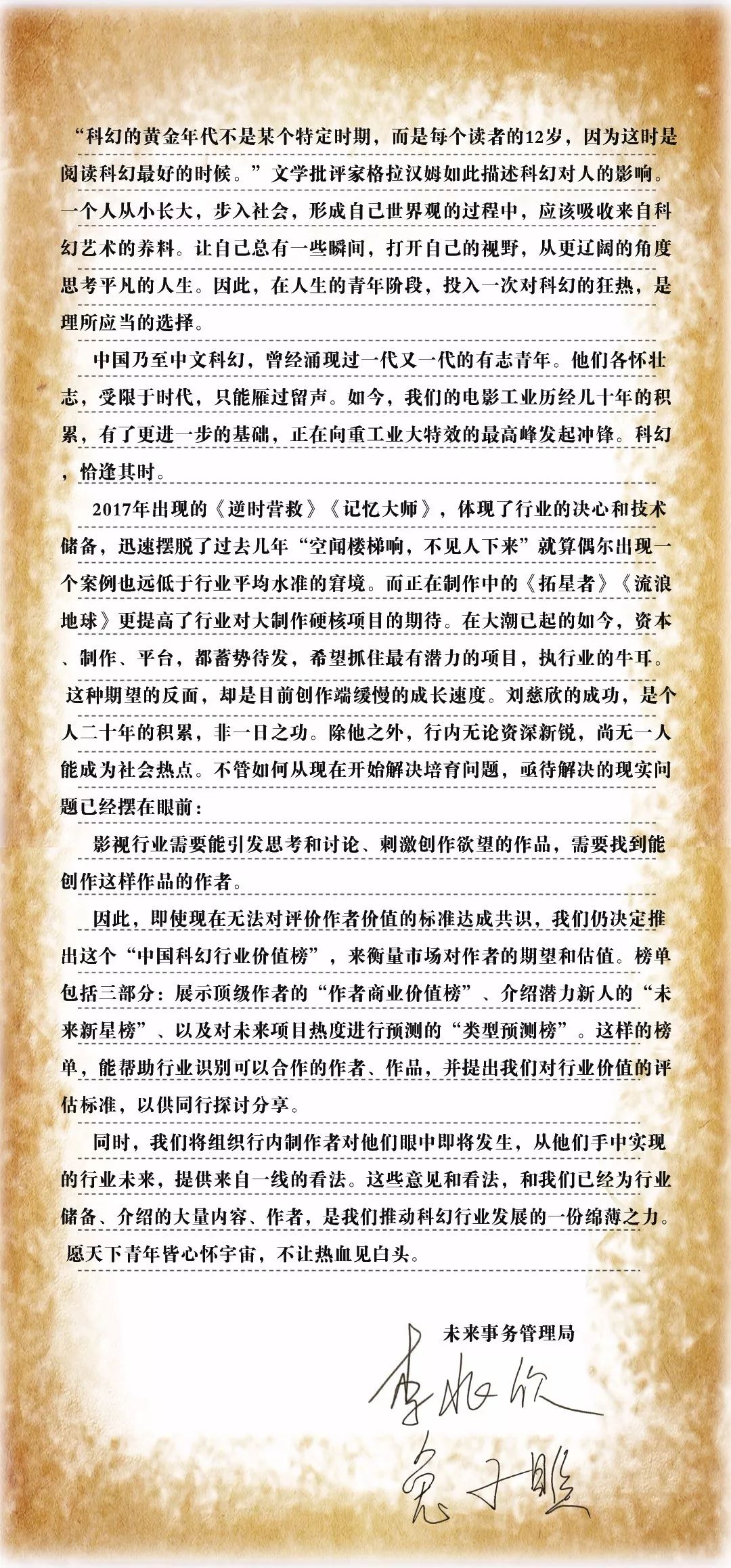 中国科幻电影正处在一个新的交叉路口,前行路上多坎坷,要保有敢于面对失败的心。最后奉上本届论坛嘉宾,未来事务管理局合伙人李兆欣为本次活动的作序,“愿天下青年皆心怀宇宙,不让热血见白头”。