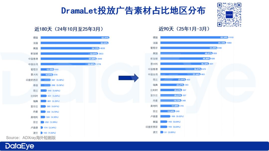 DataEye短剧观察分析,可能是受公司投放策略调整所影响。结合地区分布来看,近180天(24年10月至今)DramaLet主投德国、法国、美国、新加坡、中国香港和中国台湾,投放素材数占比均超50%,葡萄牙和意大利占比不超过13%。