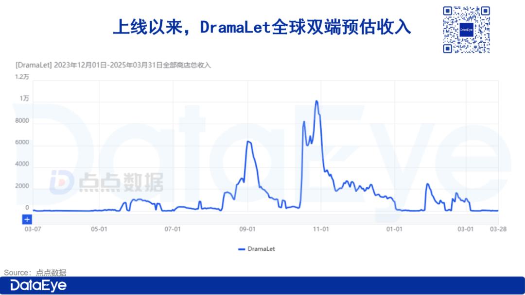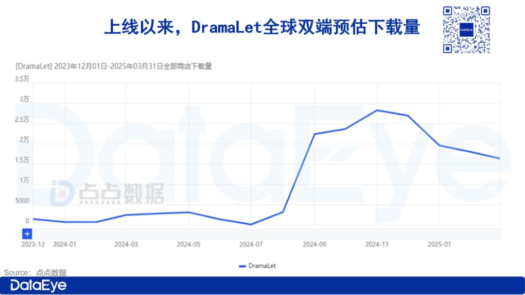据点点数据预估,上线以来,DramaLet全球双端预估收入约为46.6万美元(折合约337.8万元),全球双端预估下载量为16.96万次。