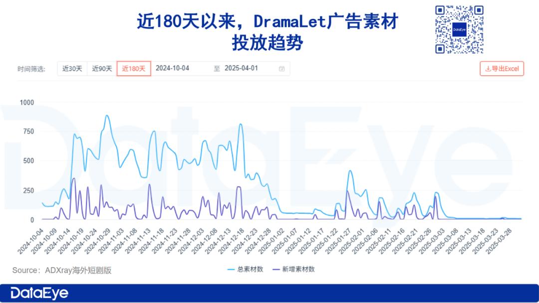 从DataEye-ADX海外版来看,DramaLet已经持续投放超过380天,共投放广告素材近43万,去重后广告素材投放数为42.9万。