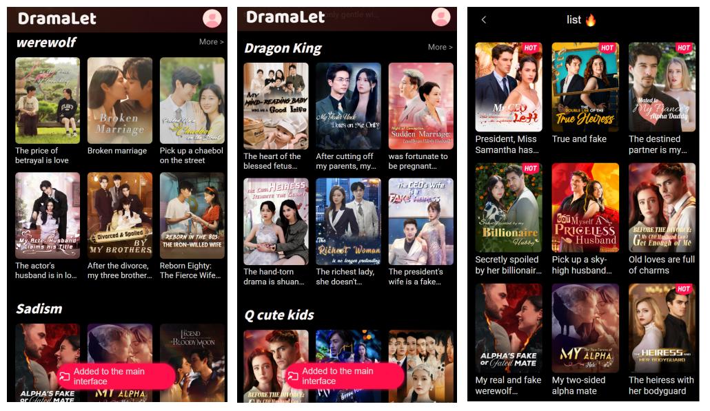 从DramaLet的网页来看,短剧数量较少,约200部左右,本土剧和译制剧均有涵盖,译制剧偏多。本土剧集中在狼人、虐恋、穿越重生、复仇等题材,而译制剧的题材主要为豪门、龙王、萌宝等。