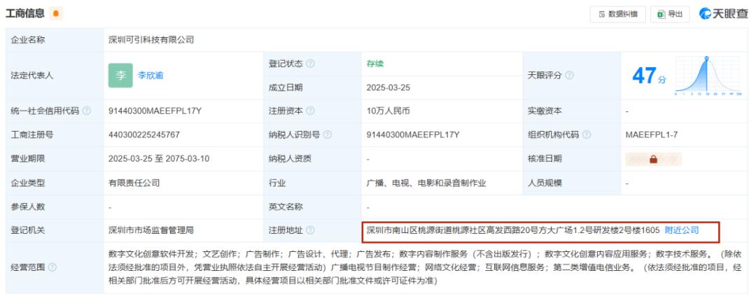 在此之前,吉比特在深圳全资持股的一家影视科技公司为深圳云梦影视科技有限公司,注资为 300 万,在 2023 年 10 月 30 日成立,该公司办公地址与新成立的 深圳可引科技 为同一办公地址,经营范围相同。