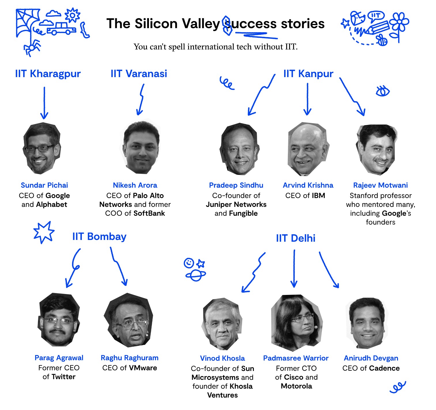 印度理工学院的超级力量在于其紧密的校友网络。从印度理工学院毕业会让你进入一个特殊的俱乐部。 通过与印度理工学院的学生、校友和教授进行交谈,你会发现该校的网络在印度及其他地区的科技生态体系的嵌入程度有多深。在一些公司,你的目光所致,都是印度理工学院的员工。创始人、导师、顾问?都是IIT。资助者?他们也是。