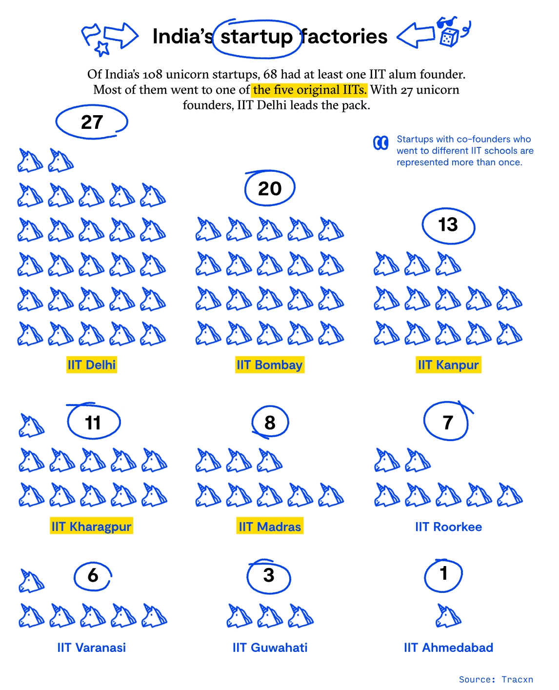 印度的创业工厂:在印度的108家独角兽当中,有68家至少有一位创始人出自IIT,这里面大部分均出自最初成立的5所分校,而德里分校的独角兽又独占鳌头,有27家