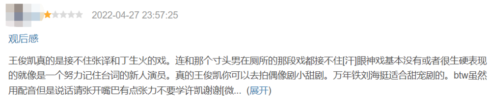 于是在异常好评被删除后,《重生之门》又被异常差评所淹没。每条差评都挂着一星,痛陈王俊凯演技如何僵硬,如何接不住前辈演员的对手戏。