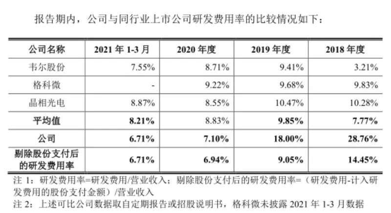 报告期内,思特威的研发费用分别为0.93亿元、1.22亿元、1.08亿元和0.36亿元,研发费用率分别为28.76%、18%、7.1%和6.71%,剔除股份支付后的研发费用率分别为14.45%、9.05%、6.94%、6.71%,下滑严重;且从2019年起,思特威剔除股份支付后的研发费用率便开始低于同行平均值。