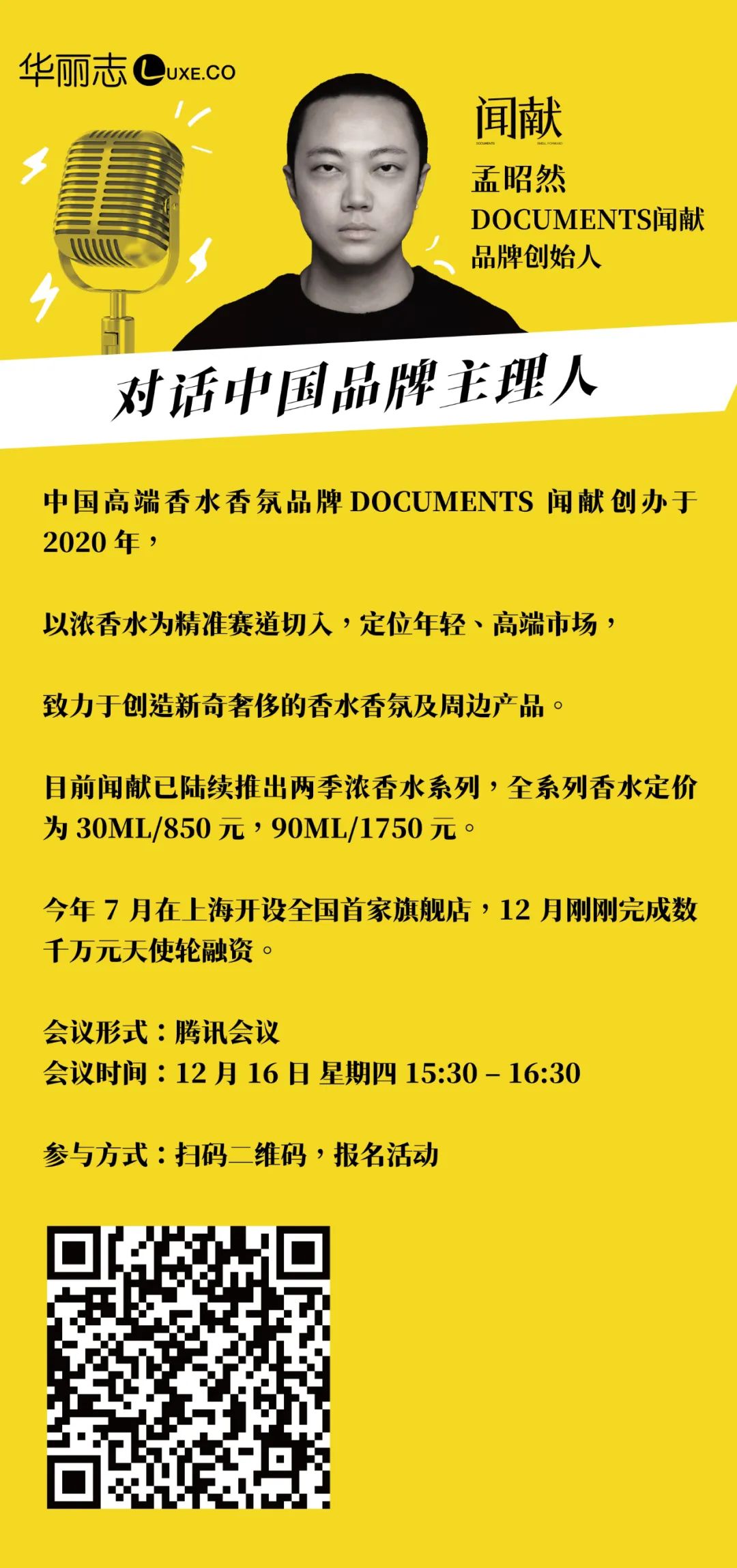 12月16日,中国高端香水香氛品牌 DOCUMENTS闻献(以下简称“闻献”)创始人孟昭然将做客《对话中国品牌主理人》第17期线上直播间。