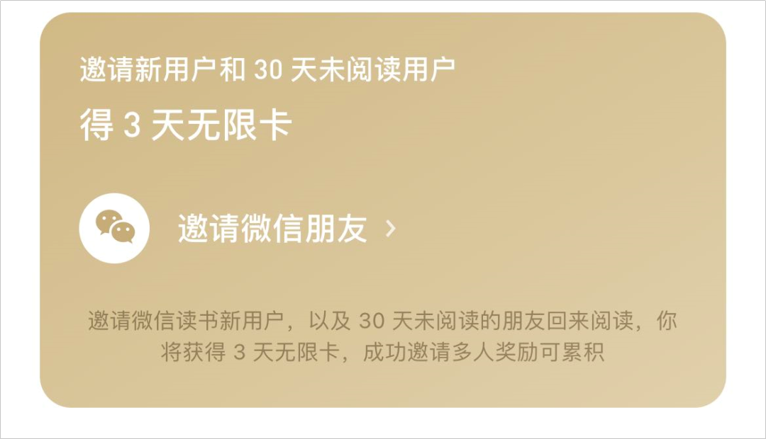 微信读书鼓励用户召回那些流失的好友,用户每邀请一个“出走”好友,就能够得到一张“ 3 天无限卡”,邀请人数越多,其奖励自然也就越多。