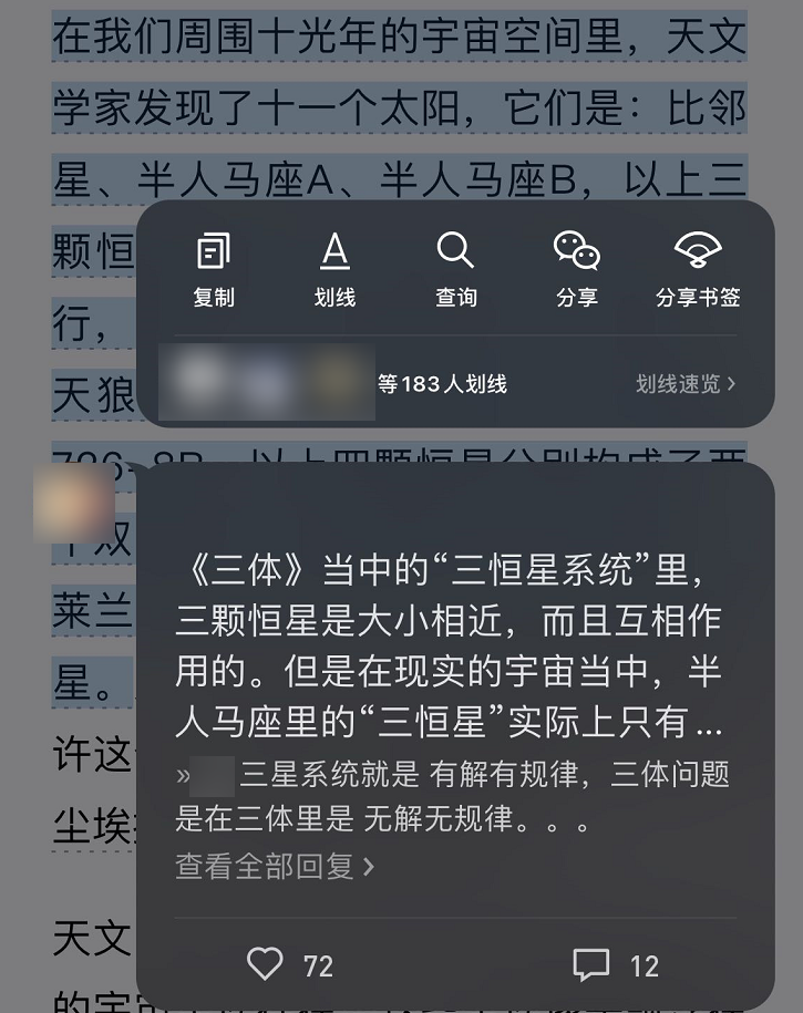 例如,有用户将科幻小说中的“三恒星系统”和现实宇宙进行对比,解释两者的不同,方便大家理解作者的写作背景。