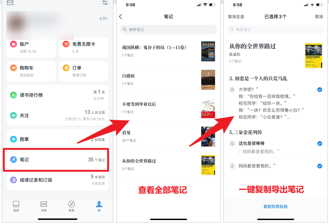 用户不但可以在阅读时,随时记录自己的阅读心得,还可以按照书籍、阅读时间查看所有笔记,并将其一键导出。