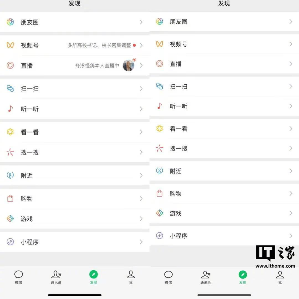 “IT之家”对比了更新前后的发现界面,可以看出选项高度有所调整,字体也变得更加清晰。