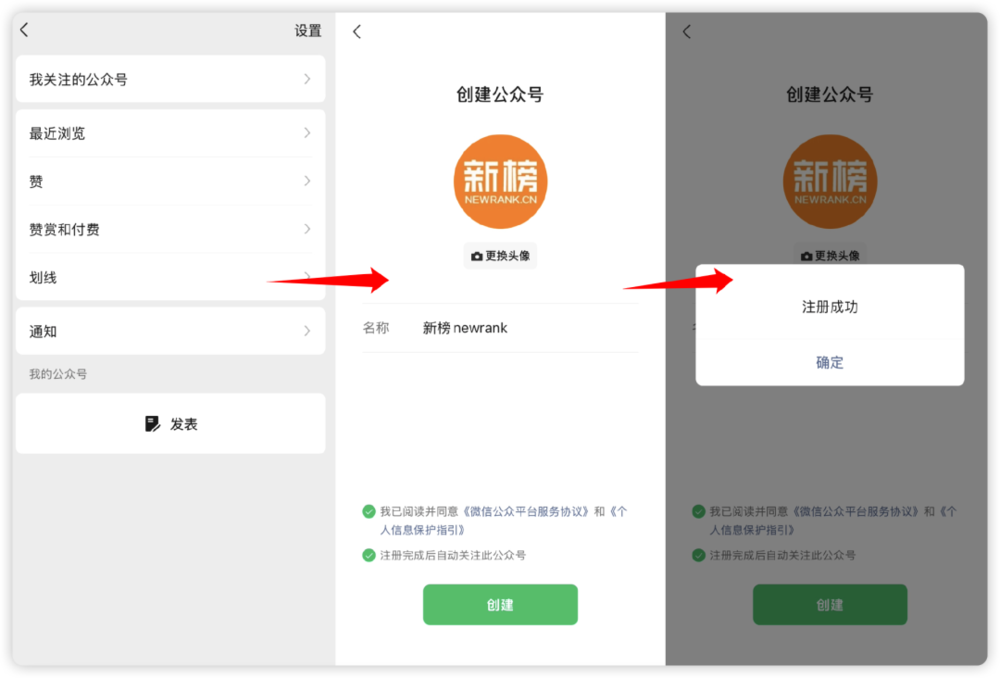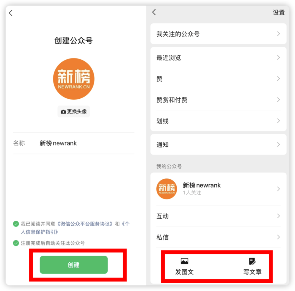 新榜编辑部发现,近期微信开始灰度测试个人微信号内直接注册公众号、发表文章,无需像过去一样借助电脑端或是“订阅号助手”等独立App,内容创作发布仅在一个微信号内便可操作完成。