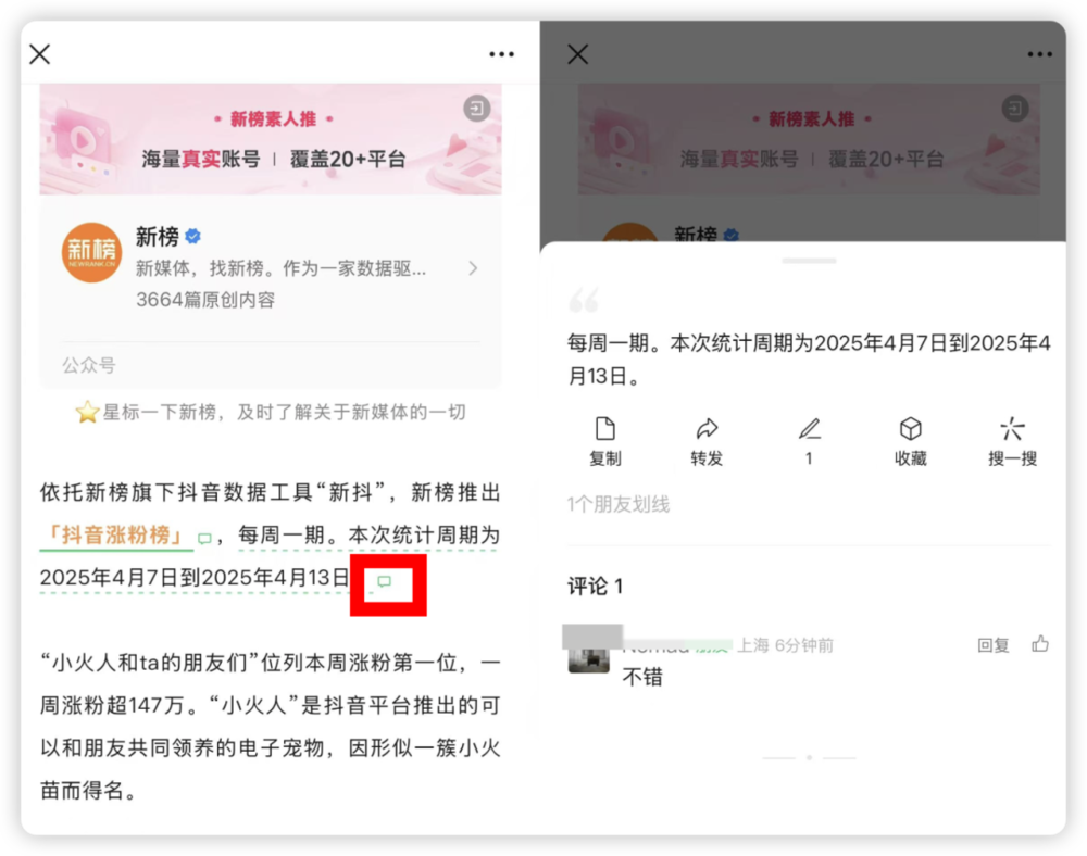 近期,微信灰度测试公众号文字“划线评论”功能,在此前“划线”文字的基础上新增了“评论”。