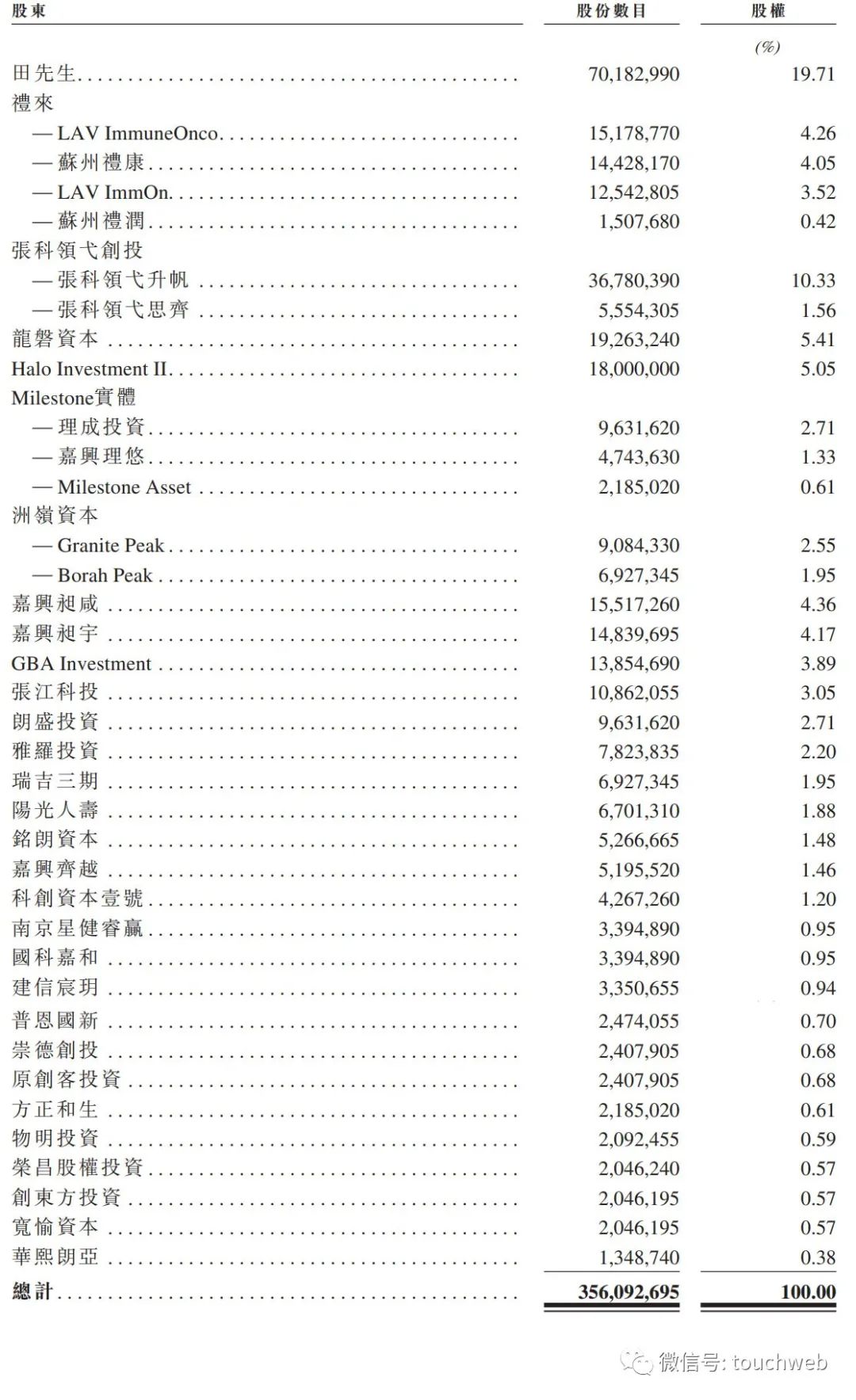 礼来持股12.25%,张科领弋创投持股11.89%,龙磐资本持股为5.41%,Milestone持股为4.65%,洲岭资本持股4.5%,大湾区基金旗下GBA Investment持股3.89%,张江科投持股3.05%,朗盛投资持股2.71%;