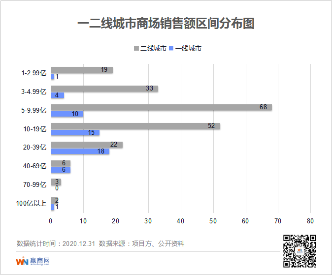 值得注意的是,销售额20亿以上的商场,一二线城市数量差距不大,一线城市25个,二线城市33个;销售额40-69亿的商场,一二线城市各占6个。