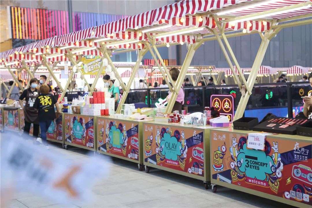 专柜品牌入驻夜市,打造接地气的市集:大卫城·夜巷子,超过2000平的超大平台,囊括了街头美食、潮流文化、手作文创、娱乐互动、美妆护肤等100+摊位。所有品牌都来自商场专柜,以“地摊价”出售,每周还会进行品牌的更新。现场还有乐队驻唱、cosplay巡游、鸡尾酒调酒沙龙等活跃气氛。