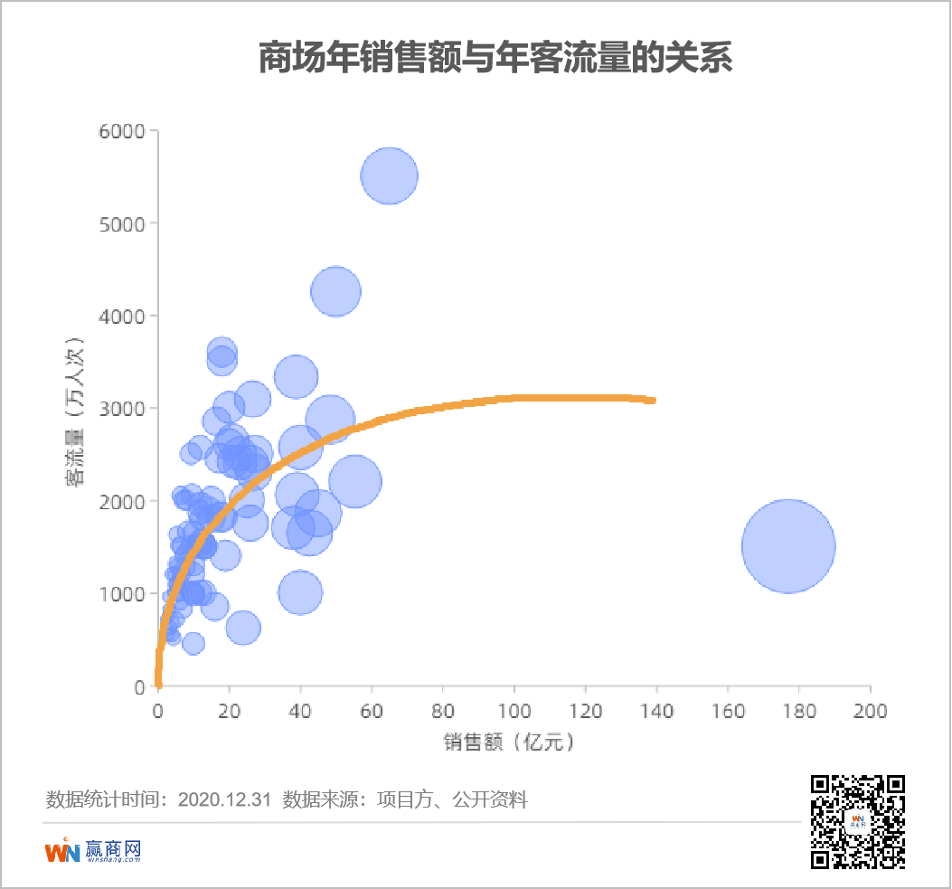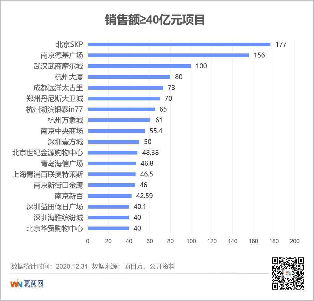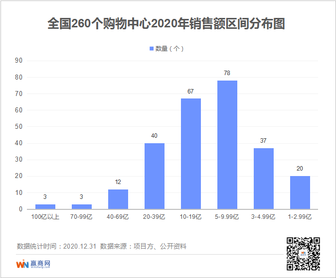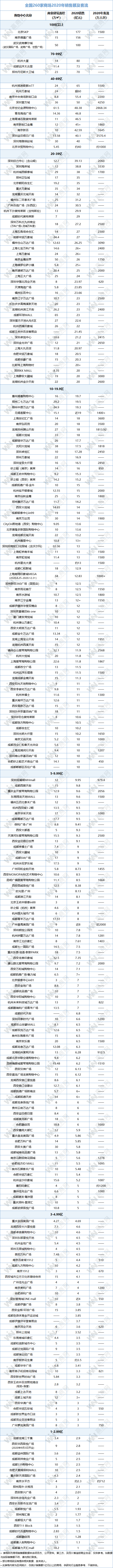 从赢商网统计的260家购物中心2020年销售额数据可以看出: