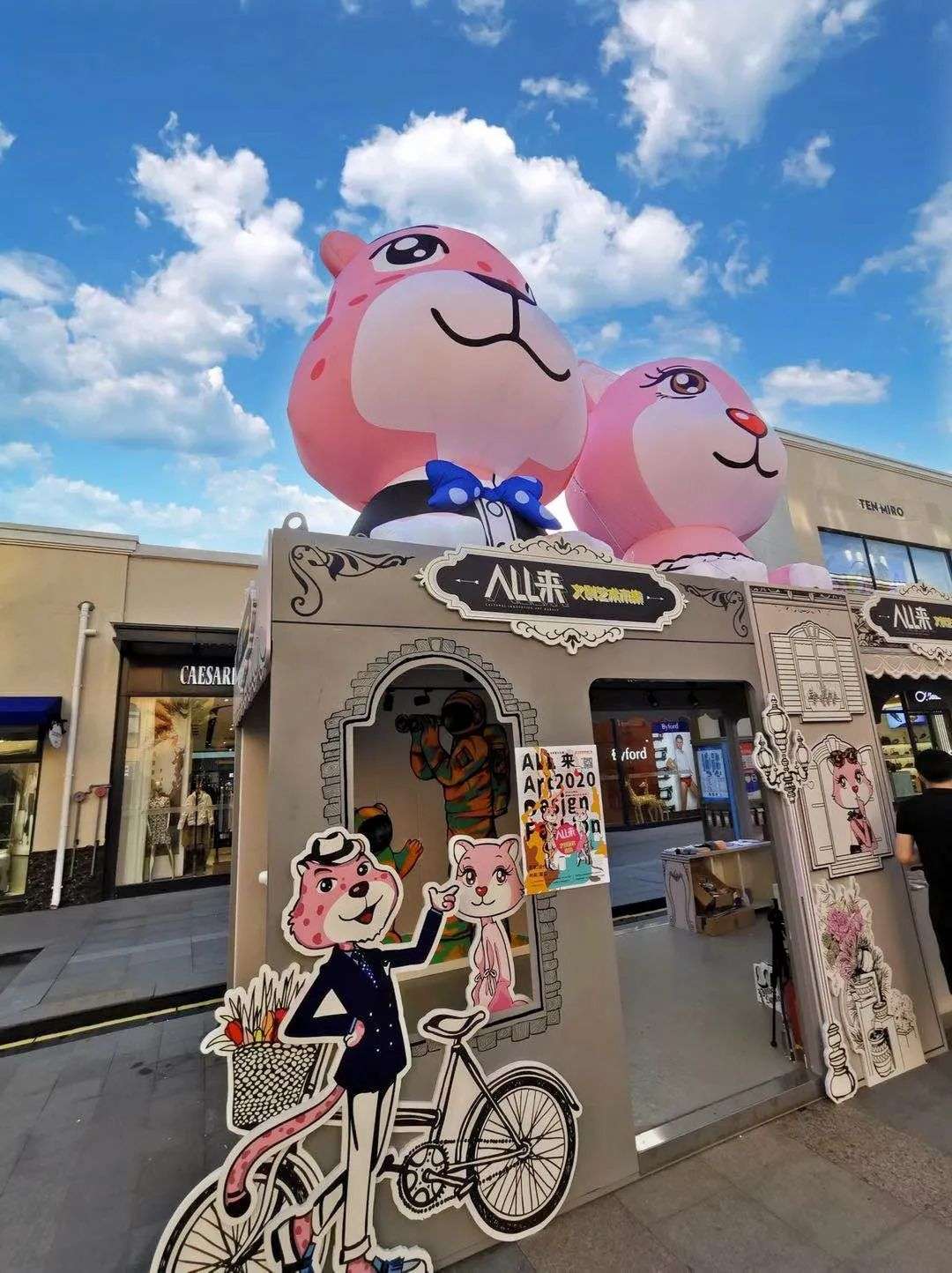 不只有折扣,还注入吸引年轻人的文艺活动:首届“ALL来·文创艺术市集”全部采用纸艺纯拼接制作艺术小店,雨棚也是由艺术家结合百联奥莱IP小豹总&豹美美进行的创意绘制。活动期间,十余位艺术家与独立设计师带来他们创作的最新作品。9月,艺术市集还将进化为“郊区YI星球”,加入潮流艺术表演,为商场添加气氛。