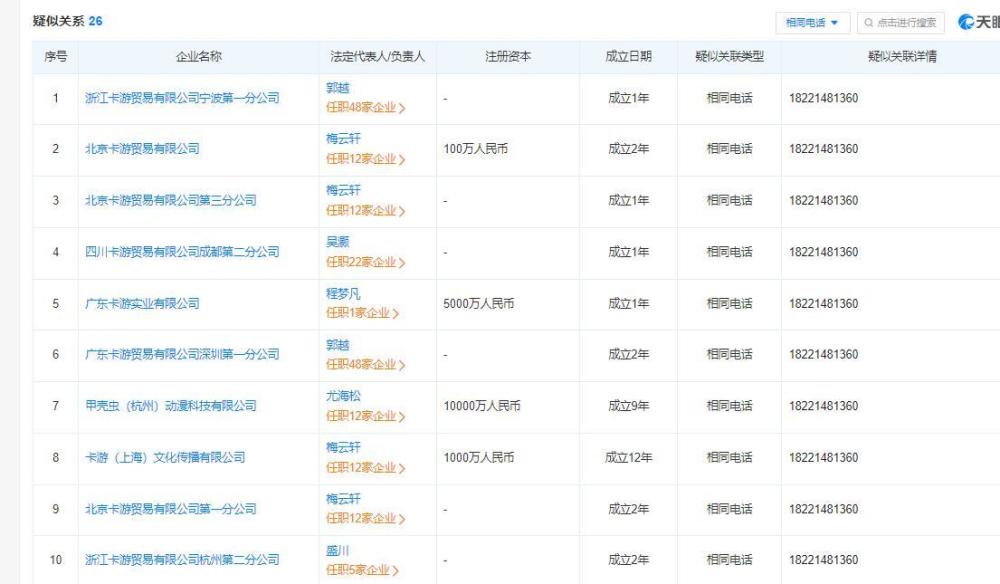 卡游关联贸易公司参保人数为0的原因成谜。作为注册地为山西的山西卡游贸易有限公司,不仅与卡游(上海)文化传播公司的电话一致,还与位于北京、广东等25家公司的联系方式一致。