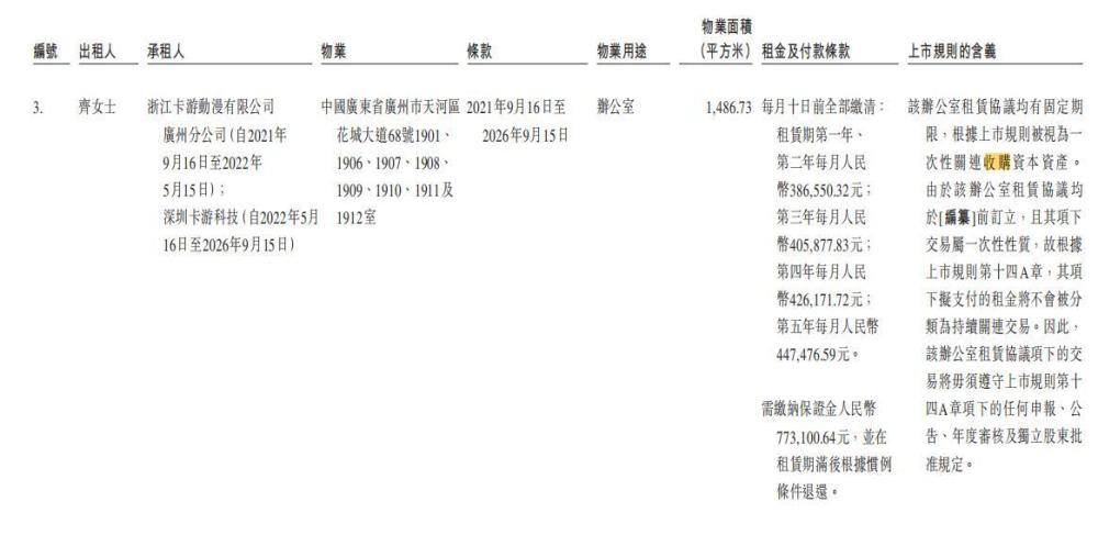 收购同年,卡游旗下的浙江卡游动漫有限公司又向原股东——实控人的妻子齐燕签订租赁合同,以承租人身份分别租1486平米、1516平米的办公室。其中一办公室的前五年月租金分别为38.6万元、38.6万元、40.6万元、42.6万元、44.7万元;另一办公室的月租金为10万元。
