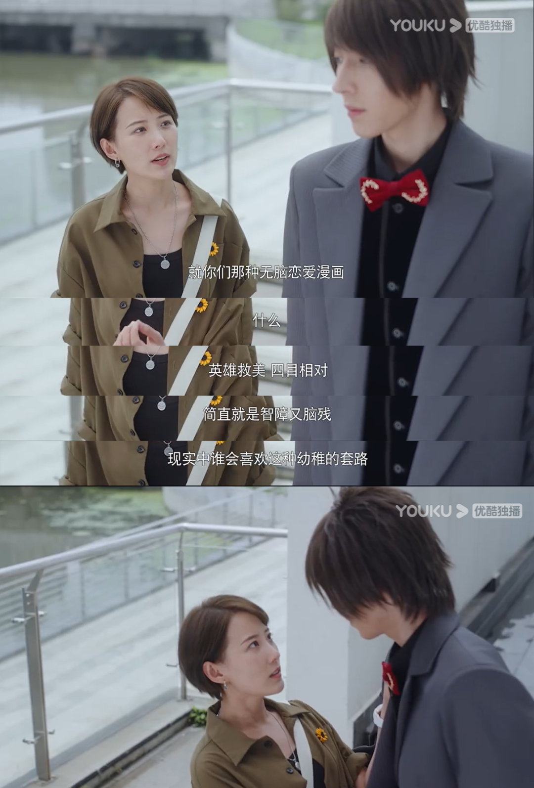 现实中的女二苏特娇觉得,英雄救美四目相对的桥段太幼稚,结果下一秒被人撞倒,漫画男主纪铭搂住了她,立马来了一个英雄救美四目相对——玛丽苏真香啊。
