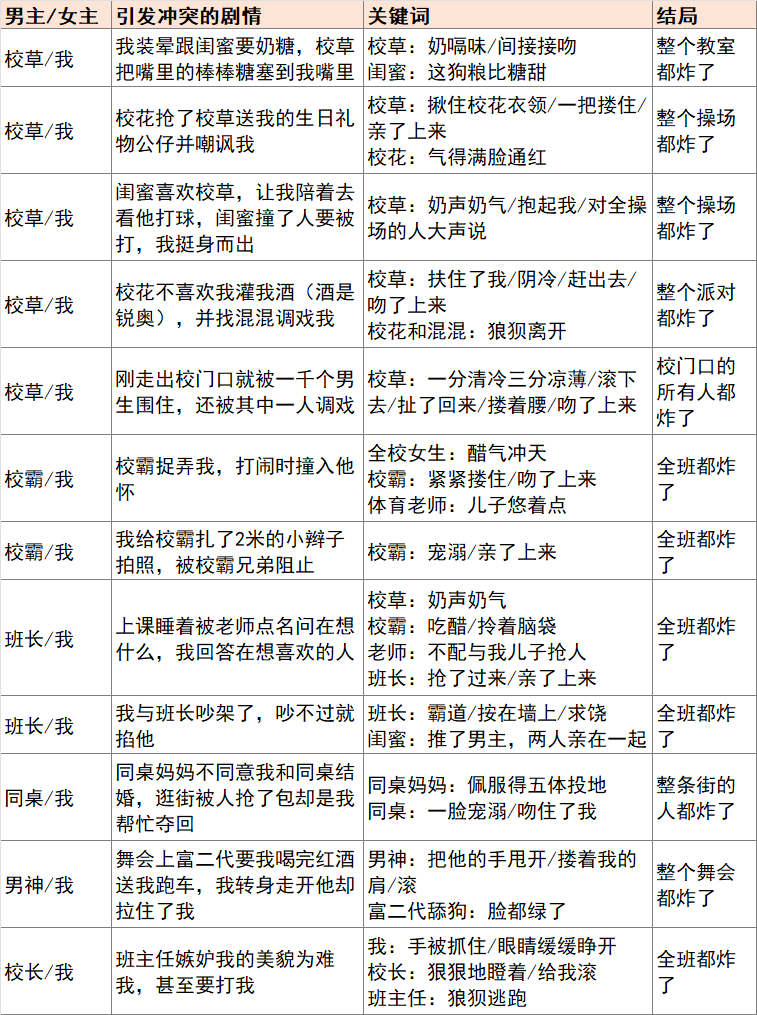 首先得有引发冲突的剧情。大部分情况下是女主被其他人欺负,譬如“校花抢了我的公仔”、“校霸不让我午睡”、“被富二代逼着喝红酒”,平平无奇的(不能称之为)“校园霸凌”剧情,才能体现男主的挺身而出是多么在(小)乎(题)女(大)主(做)。