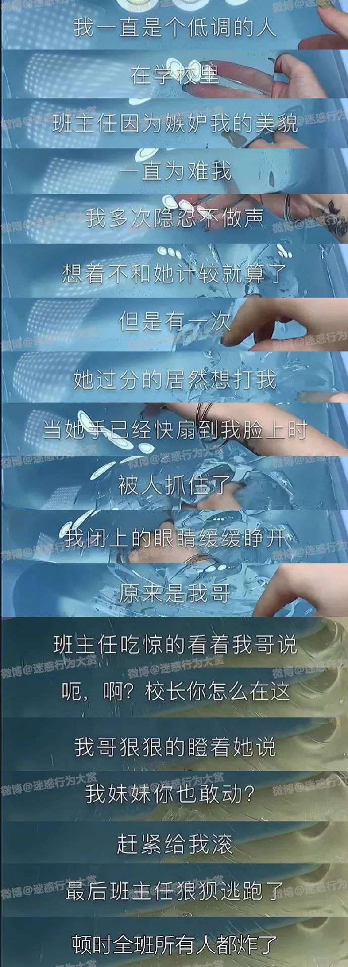 微博博主@迷惑行为大赏 热衷于将各种“尴尬的幻想”配以绚烂夺目的背景图、色彩斑斓的荧光字,用长图的形式整理分享出来,是各类“炸锅文学”故事的集大成者。