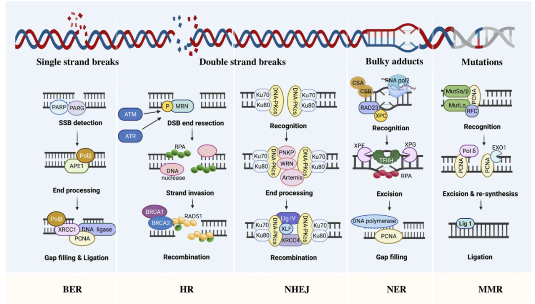 BER首先由受损的碱基启动,然后切除碱基并用新合成的DNA替换。然后,脱嘌呤/脱嘧啶核酸内切酶(APE)切割AP位点,在损伤位点形成3′OH末端。最后,DNA聚合酶和DNA连接酶在去除损伤碱基产生的核苷酸缺口处被招募,从而封闭缺口。BER负责修复小损伤,而使DNA螺旋结构变形的较大的双链断裂(DSB)则需要NER途径修复。NER机制涉及一种关键蛋白质,即切除修复交叉互补蛋白1(ERCC1),它会清除断裂点附近的DNA,然后用正常的DNA复制进行替换。