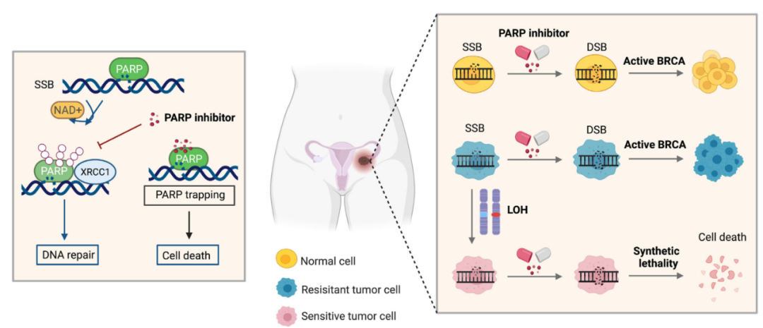 鉴于PARP在促进DNA有效修复中的关键作用,PARP抑制剂可以选择性地杀死同源重组缺陷的肿瘤细胞。PARP抑制剂是BRCA突变肿瘤的一种很有前途的治疗策略。