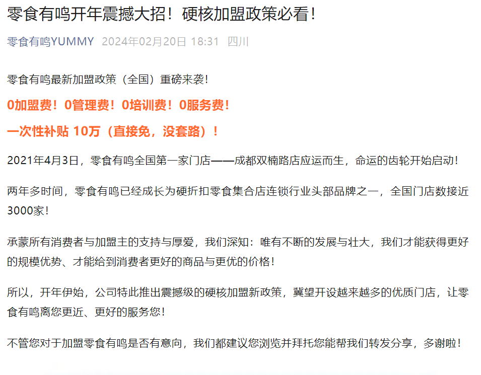 事实上,量贩零食的“规模之战”早已开打,门店数量仅次于鸣鸣很忙的好想来,推出了减免加盟费、管理费、服务费、配送费及补贴活动,爱零食也宣布下半年的加盟政策涉及巨额补贴,零食有鸣则直接宣布0加盟费、0管理费、0培训费、0服务费,同时一次性补贴10万元。